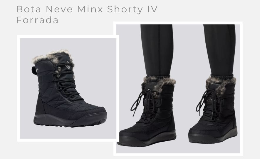 Um exemplo eficiente e versátil é a Bota Minx IV Shorty, da Columbia, que conta com isolamento térmico interno, forro acolchoado e membrana impermeável Omni-Tech, que mantém os pés secos mesmo em contato com neve ou chuva.