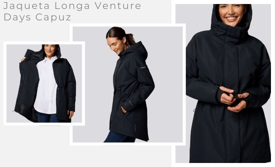 Um excelente exemplo desse tipo de vestuário é a Jaqueta Longa Venture Days Capuz, que é 100% impermeável, respirável e atua como corta-vento, graças à membrana Omni-Tech, responsável por bloquear a entrada de chuva, vento e neve. Além disso, sua construção favorece a respirabilidade e o conforto térmico, permitindo o uso prolongado ao longo do dia, tanto em passeios urbanos quanto em atividades ao ar livre.