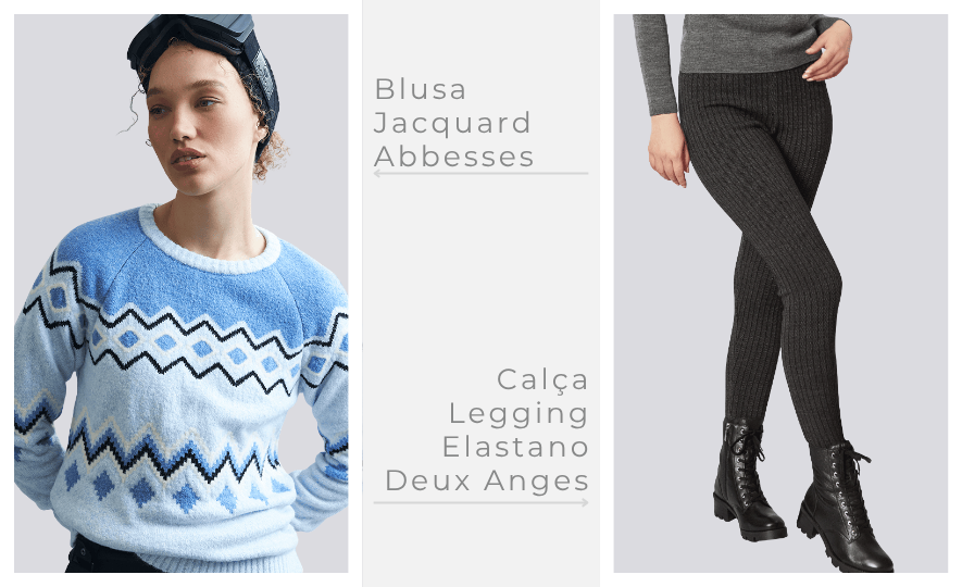 Como por exemplo, a Blusa Jacquard Abbesses, produzida em malha de tricô com elastano e fios aveludados específicos para contribuir com o fator aquecimento e delicadeza da peça. Desenhos geométricos em tons contrastantes incorporam ao cotidiano do inverno opções simples e acolhedoras para compor um look original e intenso em dias de frio. E a Calça Legging Elastano Deux Anges, em tricô encorpado com elastano, que valoriza a silhueta com efeito alongador das listras verticais e garante liberdade de movimento sem deformar.