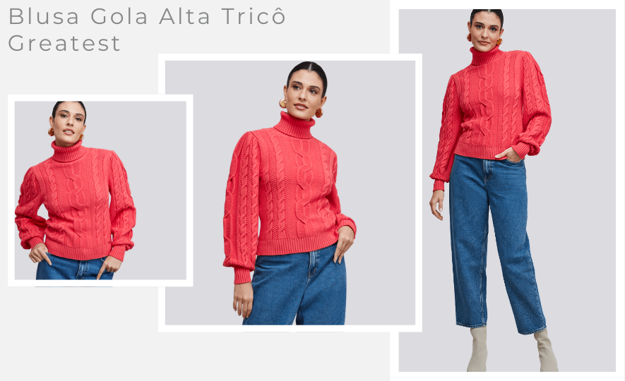 Como por exemplo, a blusa de tricô gola alta Greatest que se destaca pela malha encorpada, com tranças que criam textura e profundidade ao visual e gola dobrada. Além de mangas volumosas que acrescentam sofisticação.