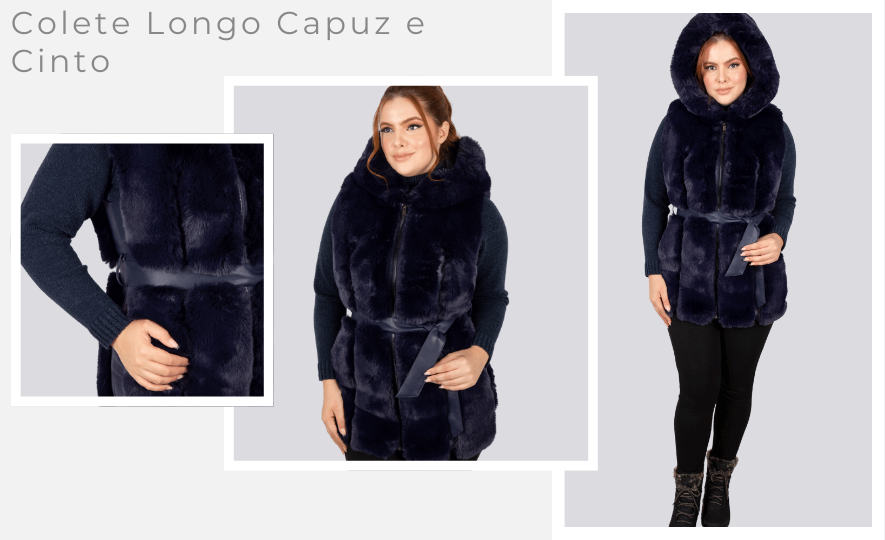 Como por exemplo, o Colete Longo com Capuz e Pelo, que une aquecimento eficiente, modelagem alongada e detalhes em diferentes texturas como pelo e couro, valorizando a silhueta e transformando looks básicos em produções estilosas e contemporâneas.