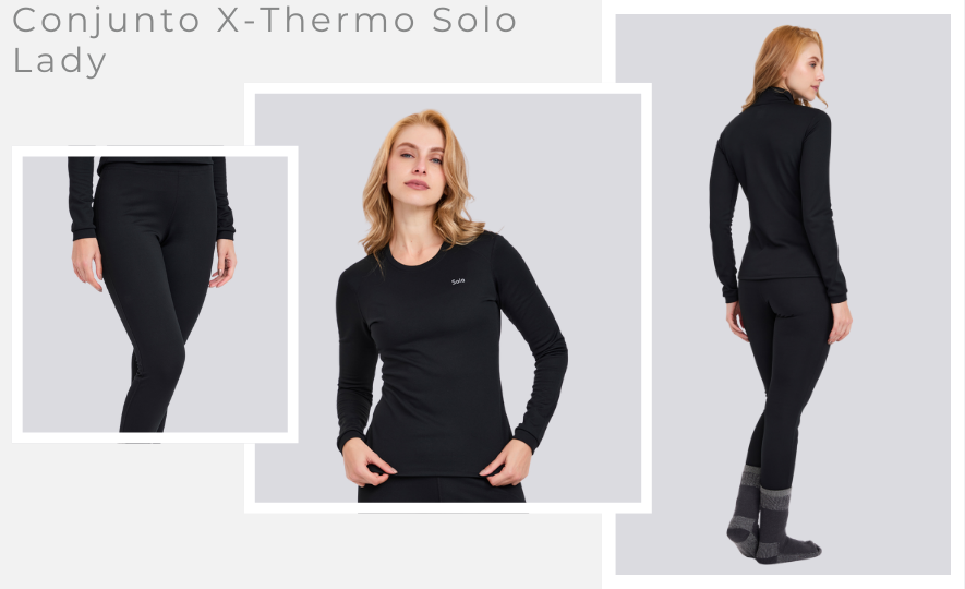 Um bom exemplo é o Conjunto X-Thermo Solo Lady, desenvolvido para atuar como segunda pele. Leve, ajustado ao corpo e com alta capacidade térmica, ele combina isolamento eficiente, respirabilidade e secagem rápida, garantindo conforto, liberdade de movimento e aquecimento constante ao longo do dia